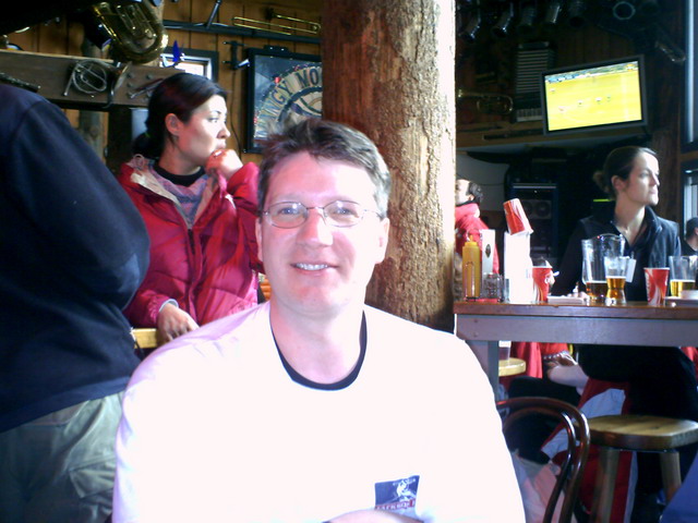 We took a quick break around noon at Bridgehead Restaurant and quickly hit the slopes again. My energy levels quickly faded and by 2:30 I had to call it quits and went to the Mangy Moose to drown my poor respitory system with some liquid pain killer. Matt threw in the towel 30-40 minutes later followed by Nate in another 30.