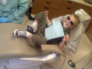 Thursday was time for my and Brandon to visit the dentist. Brandon still enjoys going and enjoys brushing his teeth so it is a pleasant experience. The visit went really well, Brandon had his teeth X-rayed and got to see his new teeth coming up. He really wants to loose those front teeth! Both Brandon and I had a clean bill of health and no cavities.